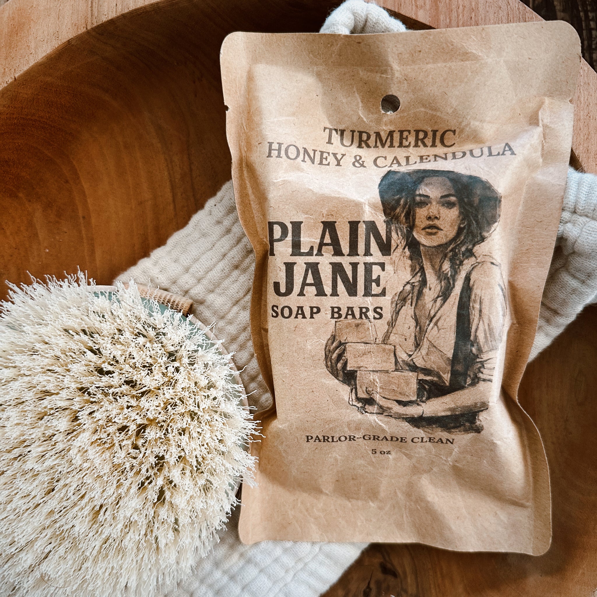 Hand-rendered tallow, lard, buttermilk, sulphur spring lye water, turmeric, calendula-infused jojoba oil, honey, and Brazilian clay.